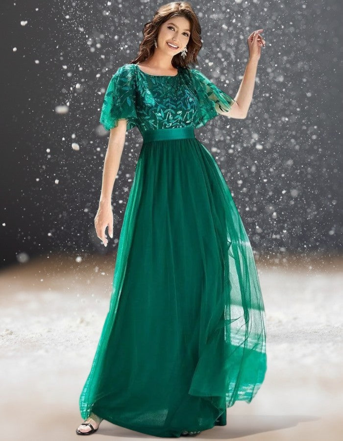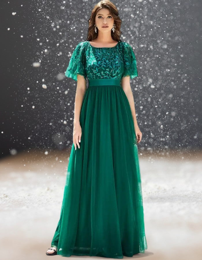 Laissez-vous séduire par la beauté de notre robe cocktail, qui a été spécialement créée pour honorer les mariages les plus mémorables. Avec ses motifs feuilles délicates et son tulle scintillant de paillettes, cette merveille verte vous transporte dans un monde d'élégance et de raffinement. Sa longueur jusqu'au sol et son col rond et ses manches discrètes sublimeront votre silhouette. Pour ceux qui veulent briller en tant qu'invité d'honneur, c'est un endroit incontournable.