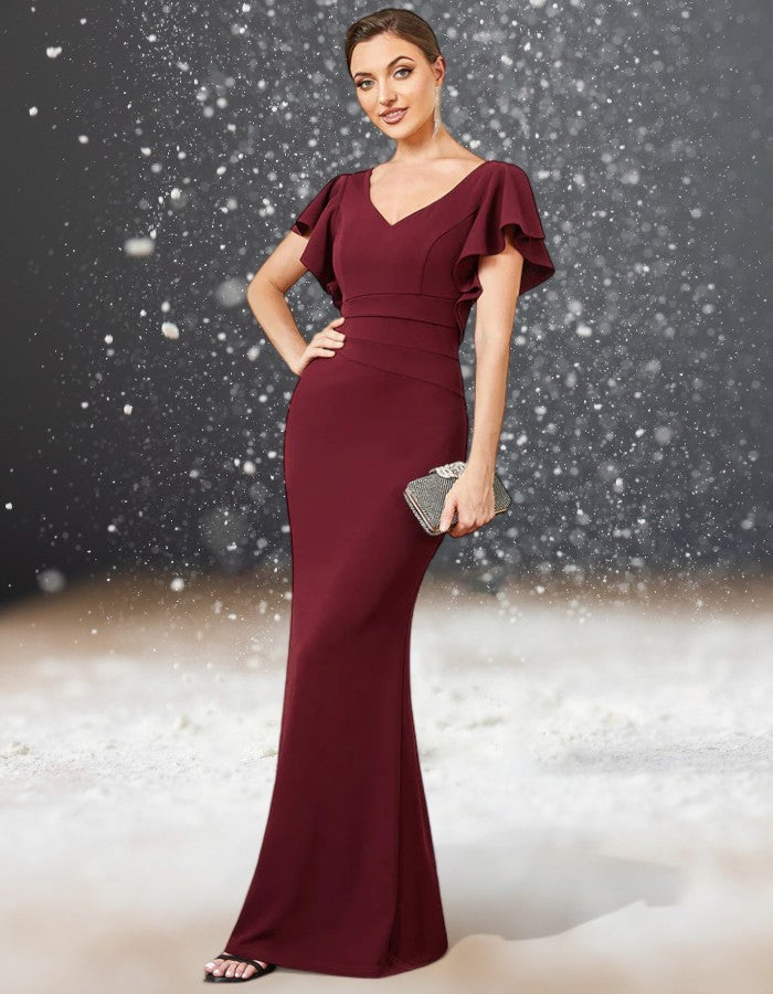 Cette robe rouge bordeaux captivante vous permettra d'être présente lors des mariages d'automne. Chaque silhouette est mise en valeur grâce à sa coupe sirène qui épouse délicatement les courbes. Les manches courtes et le col en V équilibrent la modestie et l'audace tout en offrant un confort sans précédent. La longueur au sol ajoute une touche de majesté et vous met en avant.