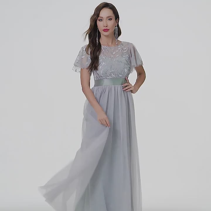 Avec cette robe cocktail grise spécialement conçue pour les mariages, découvrez une élégance intemporelle. Chaque détail reflète la sophistication, des délicats motifs feuilles en tulle pailleté qui ornent cette pièce unique, à son col rond flatteur qui ajoute une touche de grâce à votre silhouette. Sa longueur au sol ajoute une majestuosité, et ses manches complètent le look, assurant que vous serez la vedette, après la mariée bien sûr.