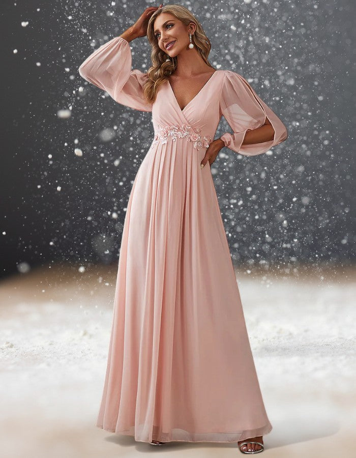 La robe cocktail mariage rose poudré est un symbole de grâce. Sa douce couleur rose poudré sublime votre allure lors de ces soirées inoubliables. Sa coupe longue ajoute de l'élégance et son col en V accentue sa féminité. Les manches longues fendues apportent une pointe de modernité tout en offrant une subtile sophistication. Enfin, la ceinture fleurie ajoute une touche romantique, ce qui rend cette robe la pièce maîtresse de votre garde-robe pour les événements importants.
